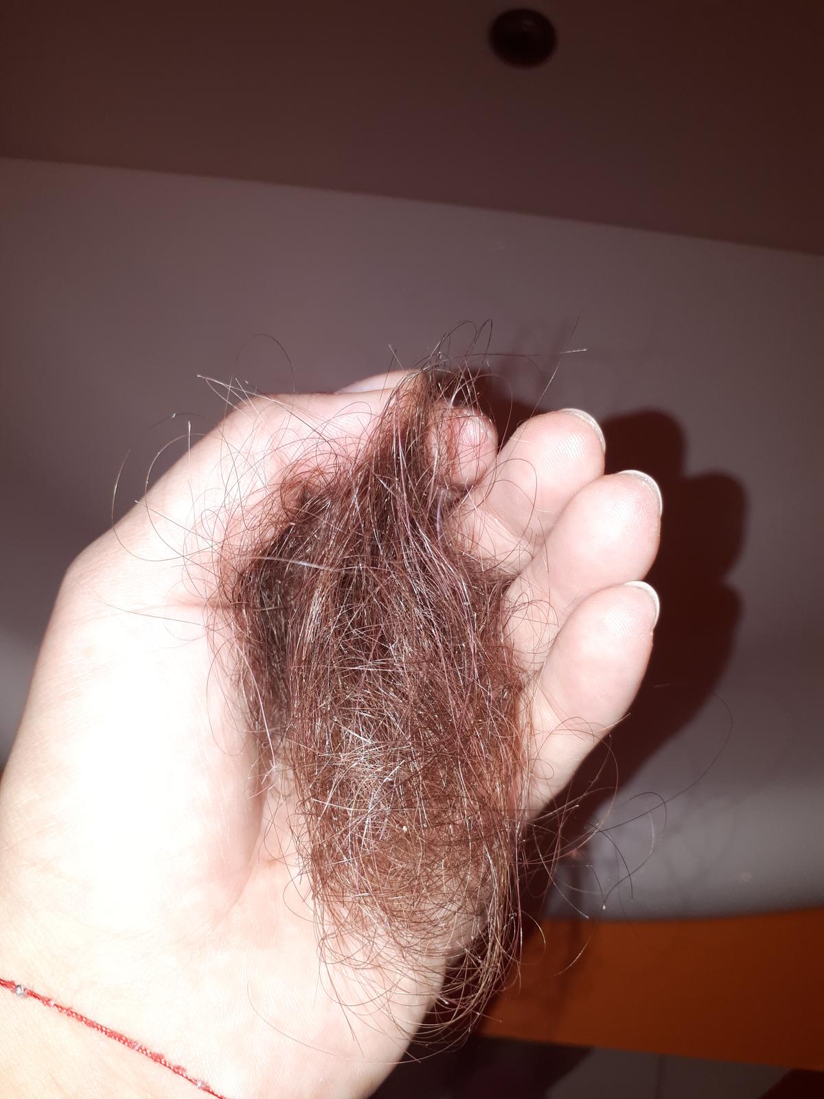 Mala som veľmi dobrý dojem zo šampónu, no moje vlasy bez kondicionéru boli strašne tvrdé, ale začala som používat aj kondicionér a už to bolo dobre. Keďže si ja vlasy nedokážem umývať každý večer, som ho používala každý druhý a každý večer elixír. Asi po týždni používania som si odfotila, koľko vlasov si vyčesem po umytí vlasov. Bol to smutný pohľad ☹ (obr.3)