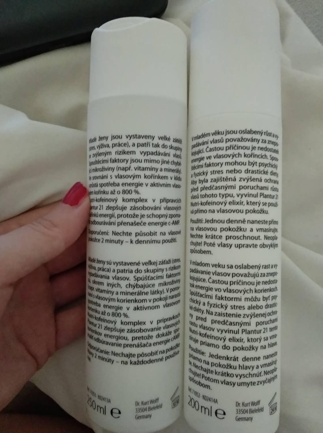A teraz, teraz sa ku mne dostal tento "zázrak". Kofeínový šampón a elixír na vlasy Plantur 21. Balíček dorazil aj s odporúčaním obdeň striedať použitie šampónu a elixíru. Asi väčšina z Vás vie, aké o je náročné si na materskej pri niekoľko týždňovom bábätku a 2,5ročnej slečne umývať vlasy každý druhý deň. Ale snažila som sa a prvé 2týždne som používala Plantur 21 naozaj poctivo. A hoci je to relatívne krátky čas, už vtedy som videla zmenu. Pokožka hlavy nebola taká suchá, vlasy boli jemnejšie a ľahšie sa rozčesávali, aj keď som nepoužila kondicionér.