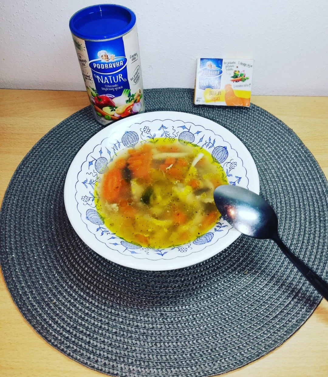 Ako posledný recept som varila našu obľúbenú kuraciu polievku so zeleninkou. Použila som kurací bujón a korenie Podravka - naša obľúbená klasika už dlhé roky. Neobsahuje konzervačné látky, glutaman sodný ani umelé farbivá. Obsahuje morskú soľ a sušenú zeleninku.